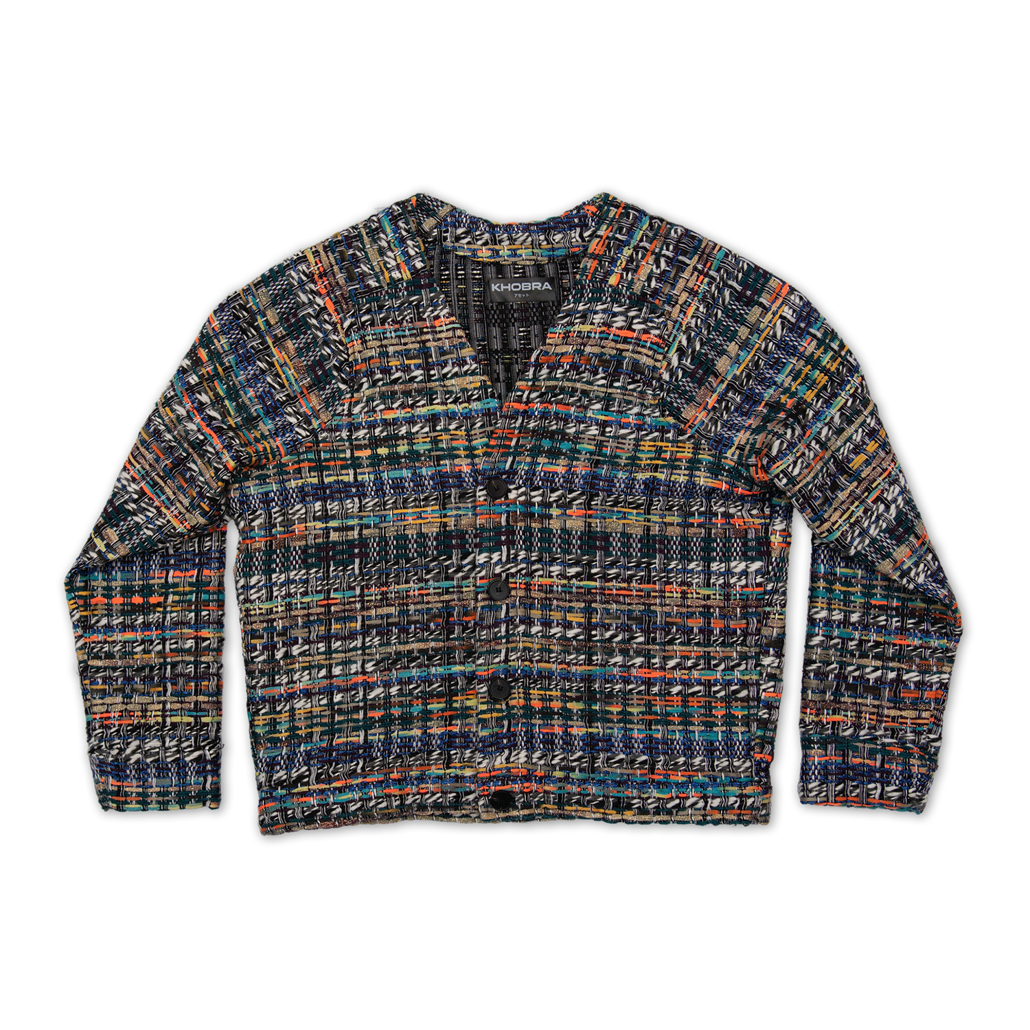Constructed in Los Angeles using a multi-yarn woven tweed for a richly textured surface. Features matching tweed cuffs and hem for a seamless look, finished with matte black buttons down the front. Relaxed drape with soft structure, designed to layer cleanly over tees or shirts. Made to order. 10-20 day shipping.