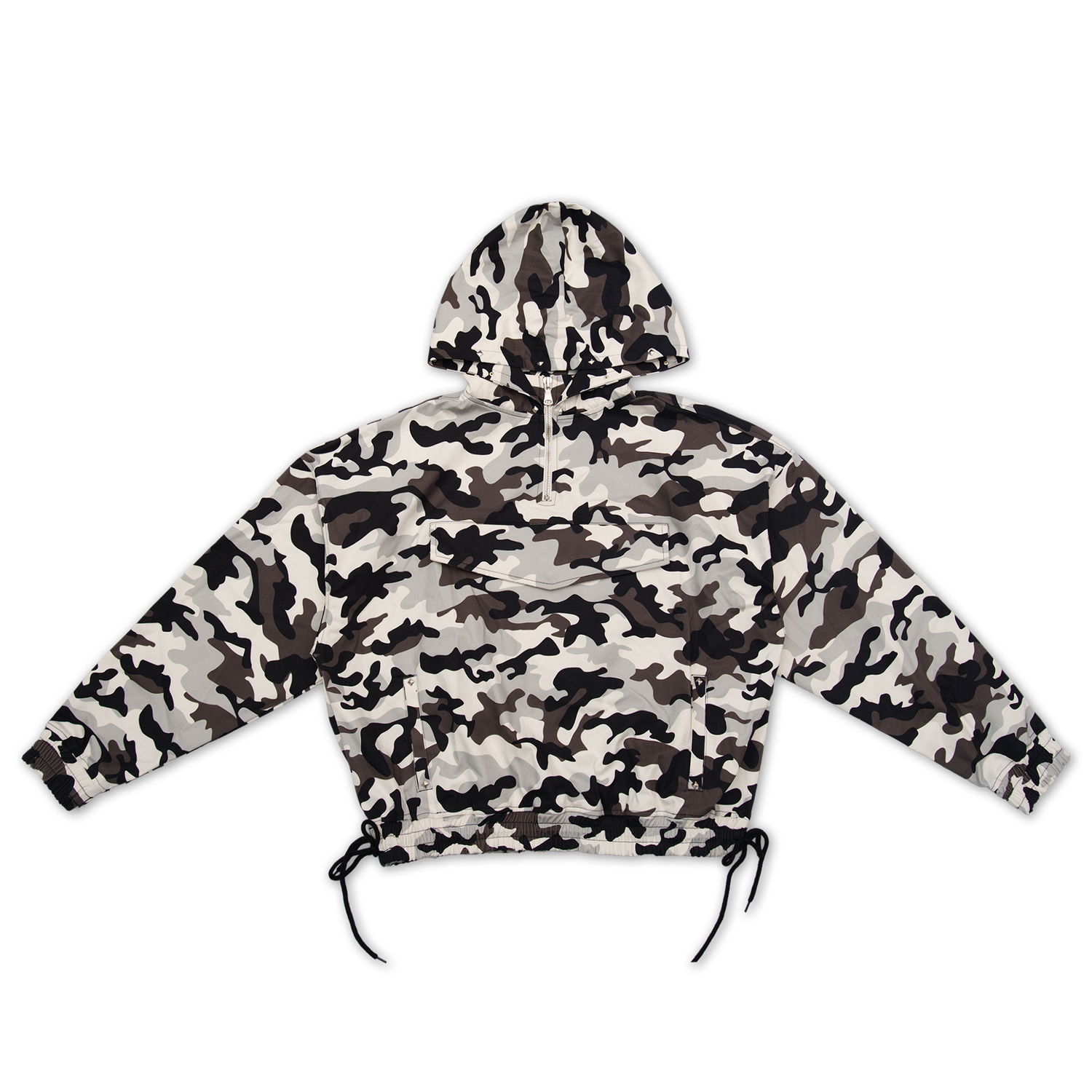 Cut and sewn in Los Angeles from matching winter camo twill. Features silver zipper hardware, silver grommets, and adjustable drawstrings for fit. Designed with a relaxed pullover shape that pairs cleanly with the convertible cargo pants. Made to order. 10-20 day shipping.
